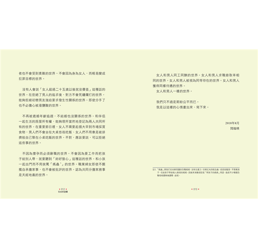 不再被適婚年齡追趕,不結婚也沒關係的世界。和伴侶一起生活的房屋所有權,能夠理所當然地登記為兩人共同所有的世界。在重要節日裡,女人不需要起個大早到市場採買食物,男人們不會坐在大桌悠哉吃飯、女人們不用像是被排擠般自己聚在小桌吃飯的世界。不對,應該要說,可以拒絕這些事的世界。