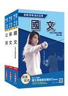 《國文》:本書依據初五等之國文考科考題趨勢編寫,共分字音字形辨正、重要修辭及應用文知識、國學常識、閱讀測驗、公文格式等五大類十五個主題。