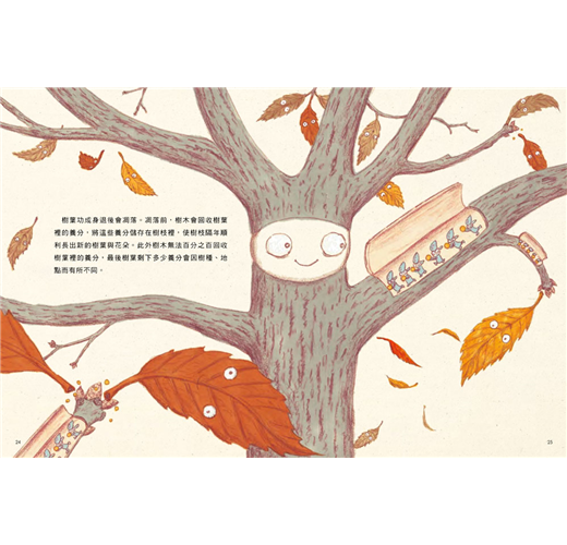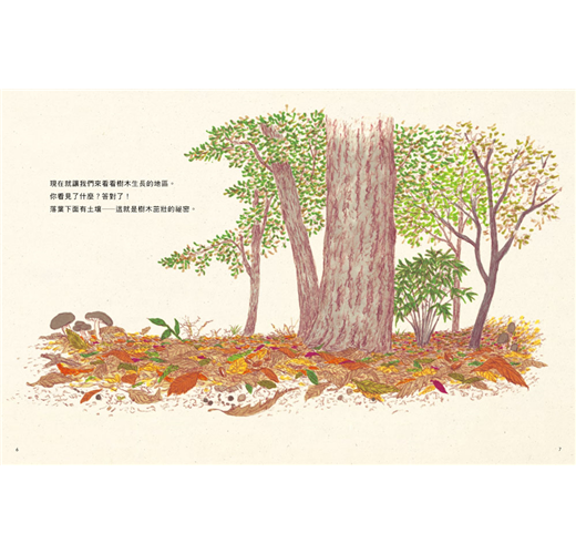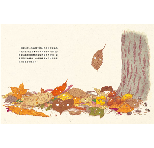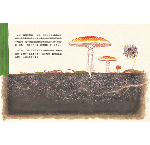 抓一把森林裡的土壤,其中存在的微生物、真菌等,這些孕育廣大森林的功臣正在努力工作著。而它們與植物又是如何相互依存、共生?在作者一層一層抽絲剝繭的介紹下,搭配畫者山村浩二可愛又詳細的圖說,訴說的不僅是一座森林運作,更是整個自然界的生存機制。在這座舞台上,每一個生命的存在都環環相扣,都非常珍貴。