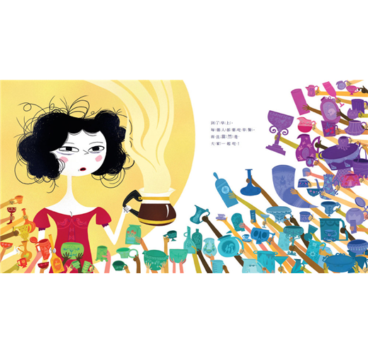 書中的矮人調皮搗蛋、吵吵鬧鬧、亂七八糟,就像孩子的化身;白雪公主洗衣服、準備三餐、說睡前故事,就如同父母或照顧者的縮影。如此的反差與真實,就像一幕幕的生活寫照,不論是大人、小孩都能引起共鳴,絕對會勾起讀者會心一笑!