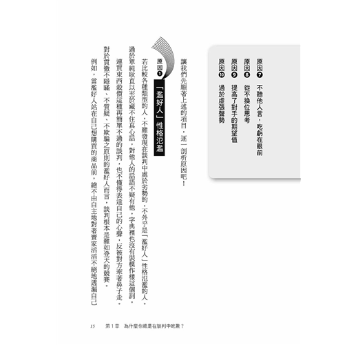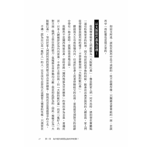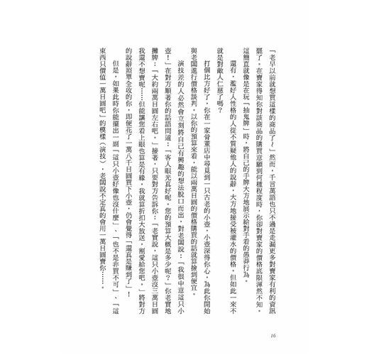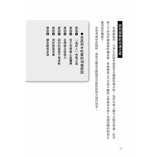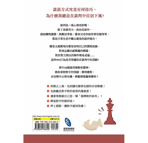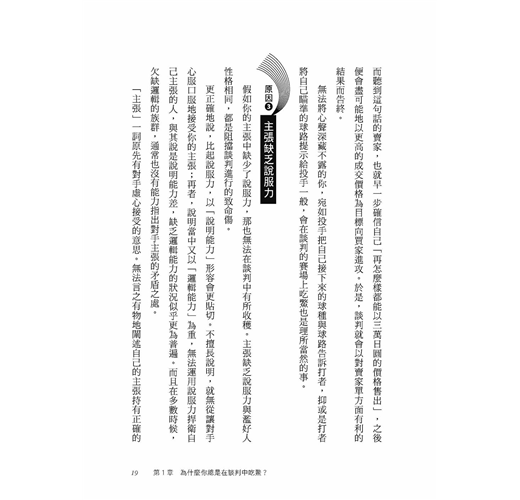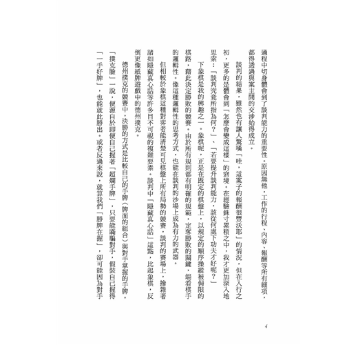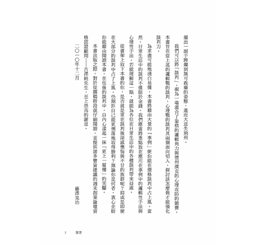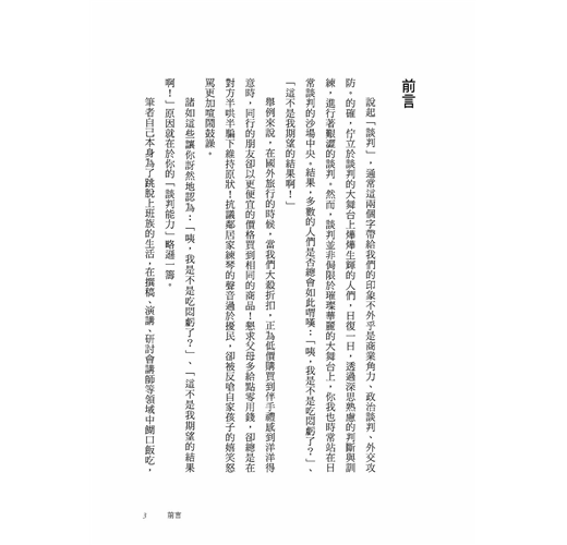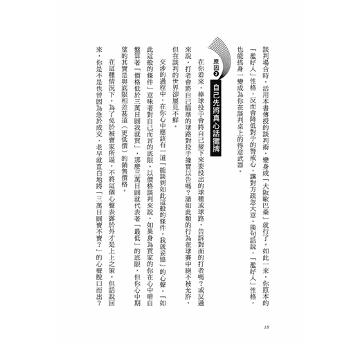 ★ 書中亦著重心理學的運用。除了應對技巧外,從對話中學習看透對手的思維和條件底線,掌握談判優勢。