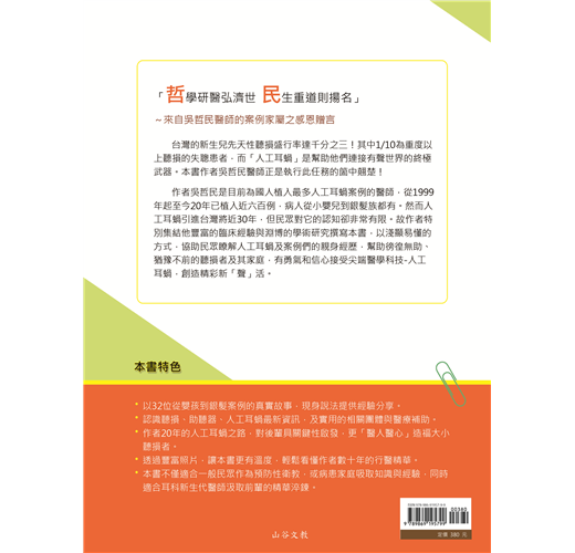 台灣的新生兒先天性聽損盛行率達千分之三!其中1/10為重度以上聽損的失聰患者,而「人工耳蝸」是幫助他們連接有聲世界的終極武器。本書作者吳哲民醫師正是執行此任務的箇中翹楚!