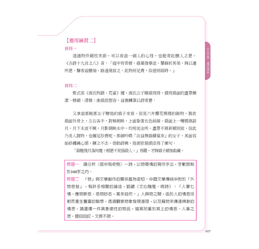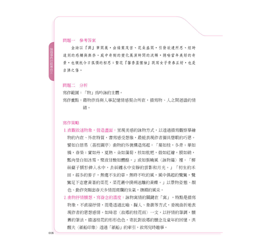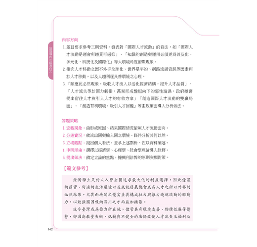 3.遷移練習:以歷屆大考題為練習平臺,進而布置情境,發展出各類生活現象與問題,使學生思索,進而提出觀點。另提供「問題分析」、「內容方向」、「答題策略」導引思路,以解決學生撰寫作文時感到內容貧乏、無法融會貫通跨領域或跨學科素材,確立脈絡之困。