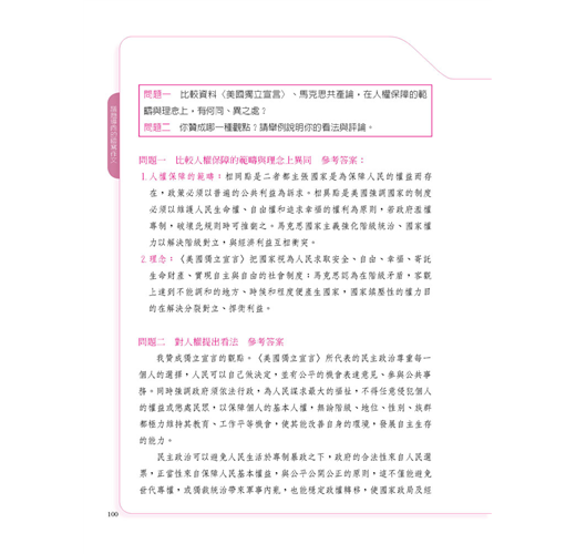 其次,在學習建構上,這本書透過情境化生活現象,考察學生是否能夠整合運用知識與技能,以處理真實世界或學術探究的問題,包括閱讀理解、邏輯推論、圖表判讀、批判思考、歷史解釋辨析、資料證據應用等。