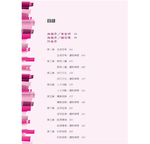 首先在課程運用上,這本書可以視為國文寫作加深加廣的專題課程素材,也可以當成多元選修課材料,與社會科、自然科課程結合,形成「主題式」的整合跨領域探究;同時適用於任務導向課程的起點,無論是國際交流、模擬聯合國、辯論比賽、口語表達與傳播,都能在其中找到觸發的支點與豐富的訊息。