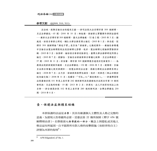 為求豐富法律教學與研究素材,並供實務辦案參考,筆者在今年二月財產法益篇問世後,不敢稍加懈怠,全力撰寫已投入多時的本書,以盡法學教育者的司改責任。但因學植未深,縱已耗盡心神,亦只能暫先完成人格法益篇,內容極具挑戰的公共法益篇,就留待第三冊處理,以讓緊繃的研究生活稍獲喘息,並避免倉促成章的瑕疵。事實上,人格法益犯罪已是刑法學習的重心,諸多議題(如安樂死、墮胎、醫療說明義務、隱私權、名譽保護與言論自由)早已成為民法與公法共同關切的對象,再經筆者詳細討論敘述,內容已足夠單獨發行。