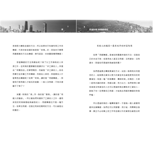 其實,財商的「商」字,指的是「智商」,講的是「有錢人的腦袋」。所以當我們知道除了工資收入之外,還有其他的財商管道能夠創造收入,用錢賺錢也只是一種方法,如果沒有錢,但是也有其他聰明的方法,可以創造出財富的。