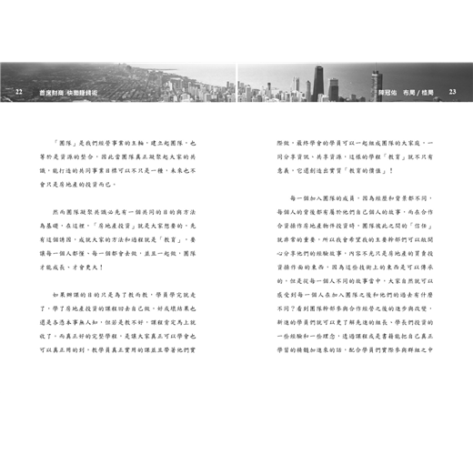 由投資房地產的團隊分工參與技術性的實戰操作,進階開創出財商資產與商業模式建構之經營事業,分享每一位素人變強人的成功經歷和軌跡。