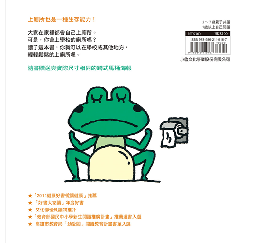 本書是專為學齡前的孩子創作的便便繪本,讓孩子在跨越幼兒園與小學當中,能夠學習如何使用學校廁所的蹲式馬桶,書末還有廁所小百科,介紹各式各樣的廁所。作者詼諧的文字搭配繪者幽默、明亮的插圖,讓孩子不再畏懼學校的廁所!