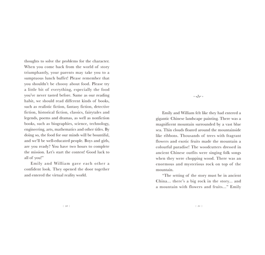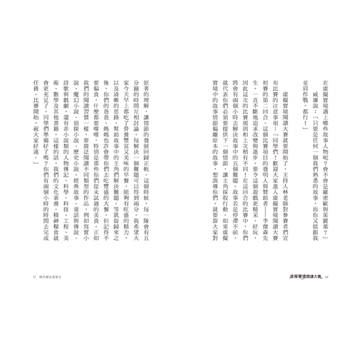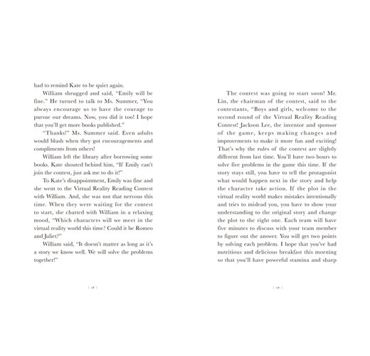 虛擬實境閱讀大賽就要開始了,主持人林老師對參賽者們宣布比賽的注意事項:「同學們!歡迎大家進入虛擬實境閱讀大賽初賽的第二回合。這個比賽項目的發明人與贊助者──李傑森先生,一直不斷地追求改變與進步,要令這個遊戲更精采、好玩,因此這次的比賽規則和上次稍有不同!在這回合的比賽中,你們將會有兩個小時去解決故事中的五個難題。故事若是停滯不前,就代表你們必須要提供下一個情節,讓主角採取行動。如果虛擬實境中的故事情節偏離原本的故事,想誤導你們,就要靠大家對原著的理解,讓情節的發展回歸正軌。這個時候,每一隊會有五分鐘的時間互相討論。每解決一個難題可以得到兩分。我希望大家今天早上都吃了營養豐富又美味的早餐,能夠有旺盛的精力,以及清晰的思路,幫助故事中的主角們解決難題。等凱旋歸來之後,你們的爸爸、媽媽也許會帶你們去吃豐盛的大餐,但記得不要偏食,什麼都要嚐嚐,特別是那些你們從未試過的美食。正如我們的閱讀習慣一樣,要廣泛閱讀不同類型的作品,例如寫實小說、魔幻小說、偵探小說、歷史小說、經典故事、童話與傳說、詩歌與戲劇,還有非小說類的人物傳記、科學、科技、工程、美術、數學及其他書籍,這樣的話,我們的文化素養、精神糧食就會更充足了。同學們準備好了嗎?你們有兩個小時的時間去完成任務,比賽開始,祝大家好運。」