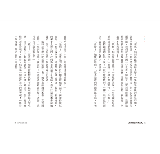 「噓──」夏老師一如往常提醒凱特不可以在圖書館大聲喧譁,但卻隱藏不了開心的神色,「這本書才剛上市,想不到這麼快就被你發現了。凱特,你是第一個請我簽名的讀者呢!」凱特十分得意,萊恩也在一旁笑著。