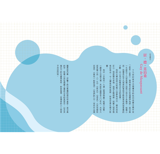 十九世紀法國優秀的批判現實主義作家(1850~1893),曾拜著名的作家福樓拜為師。莫泊桑一生創作了六部長篇小說和三百五十多篇中、短篇小說,他擅長從平凡瑣屑的事物中截取富有典型意義的片斷,以小見大的概括出生活的真實。他的文學成就以短篇小說最為突出,構思別具匠心,情節變化多端,描寫生動細緻,刻劃人情世態唯妙唯肖,令人讀後回味無窮,對後世產生極大影響。