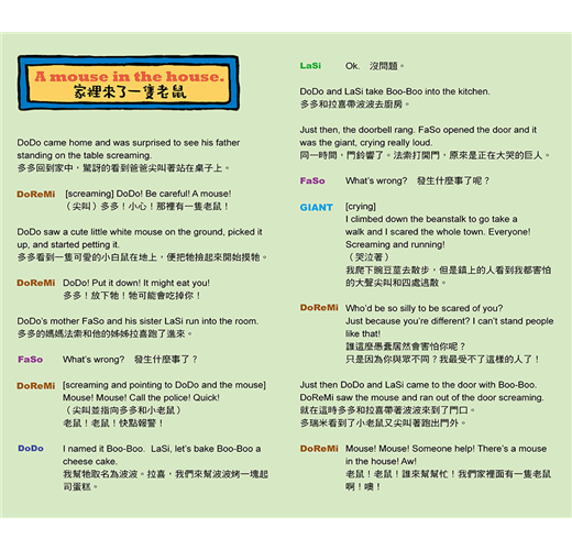 3.中英雙語情境互動劇場:收錄中英雙語情境話劇劇本〈家裡有老鼠〉,為本書故事的延伸遊戲,家長或老師帶著孩子一起朗讀劇本,熟悉臺詞後可以搭配動作演出,讓語言學習成為一個好玩的遊戲!