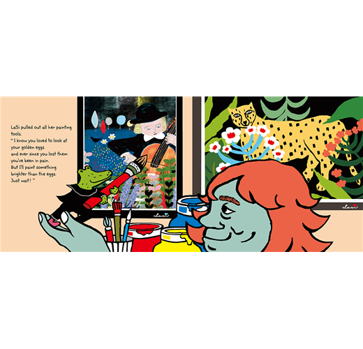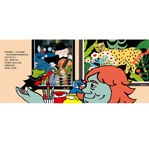鱷魚姊姊拉喜:多多的姊姊,擅長勞作與塗鴉,仔細看書中鱷魚家族的屋子裡,布置了很多拉喜的畫作喔!