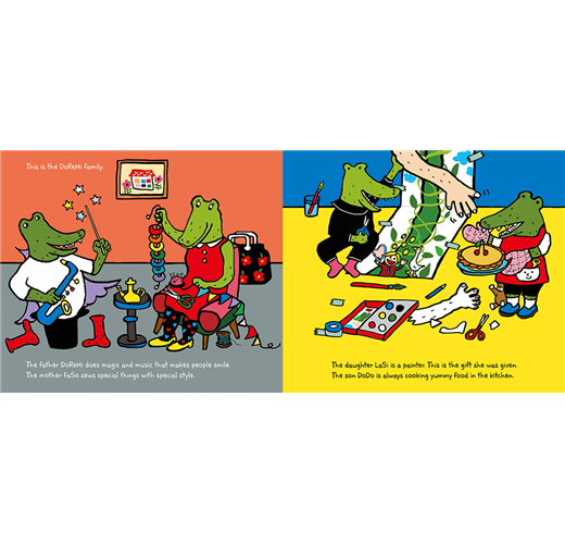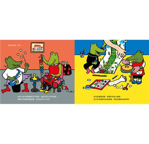 小鱷魚家族多才多藝,爸爸多瑞米會變魔術和玩樂器;媽媽法索喜歡縫縫補補,做些新奇的小玩意;姊姊拉喜愛塗鴉;弟弟多多喜歡做各種好吃的料理。