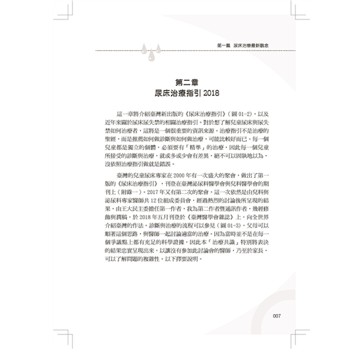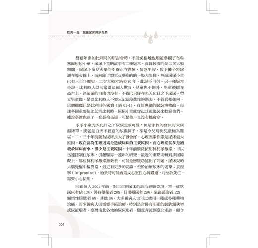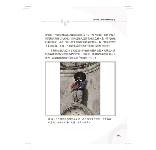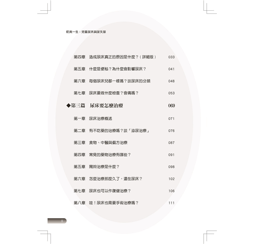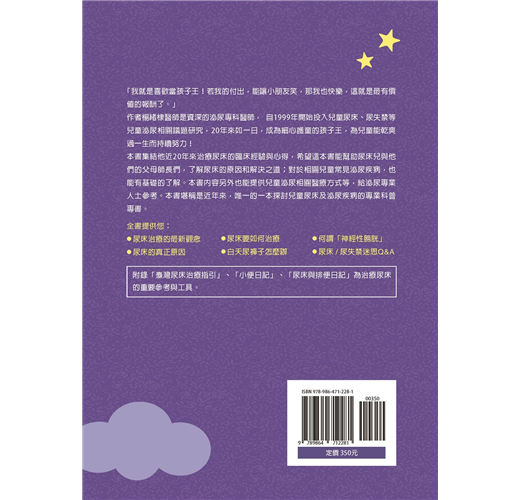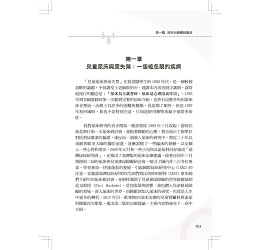 本書集結他近20 年來治療尿床的臨床經驗與心得,希望這本書能幫助尿床兒與他們的父母師長們,了解尿床的原因和解決之道;對於相關兒童常見泌尿疾病, 也能有基礎的了解。本書內容另外也能提供兒童泌尿相關醫療方式等,給泌尿專業人士參考。本書堪稱是近年來,唯一的一本探討兒童尿床及泌尿疾病的專業科普專書。