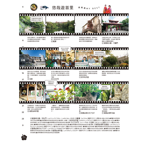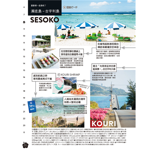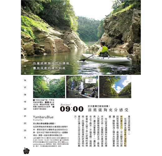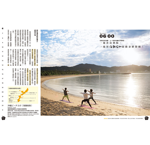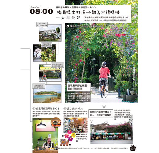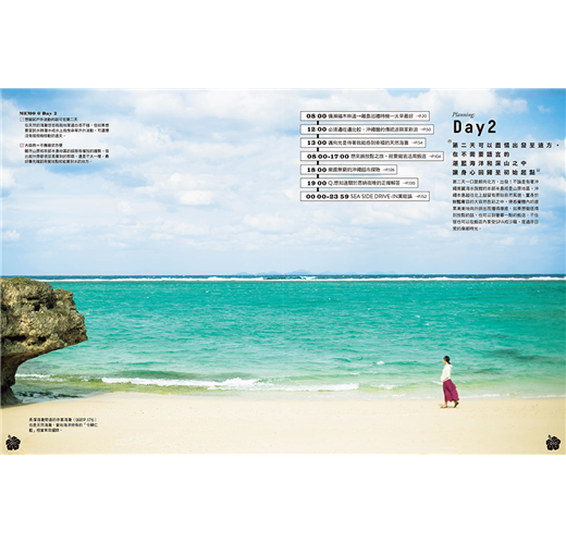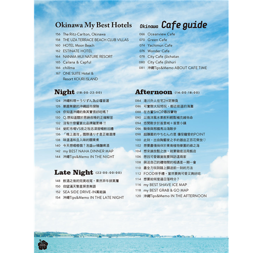 ★將一天的時間拆解,解析出各時間帶的推薦好去處。列舉場域或店家的基本情報與特性,讓你便於從中擷取出適合的選項。涵蓋在地生活品味、體驗深度文化、品嚐道地美食、走訪特色店鋪等不可或缺的旅行主題,針對不同的氛圍與心情,巧妙組合出變化多端的旅遊選單。不是要你非得跟著介紹走,而是引導各位打造出屬於你自己、也能推薦給他人的自我流「沖繩時光」。
