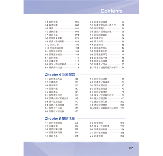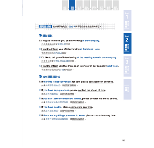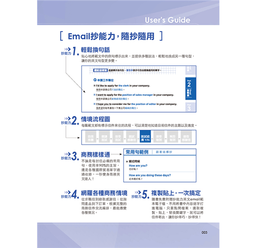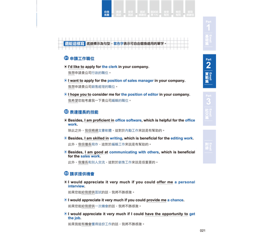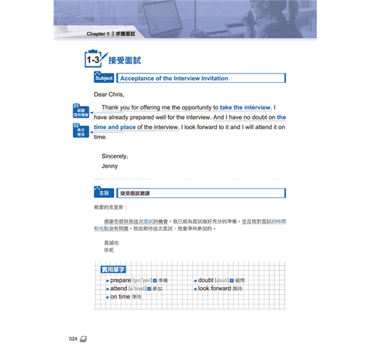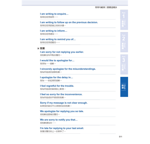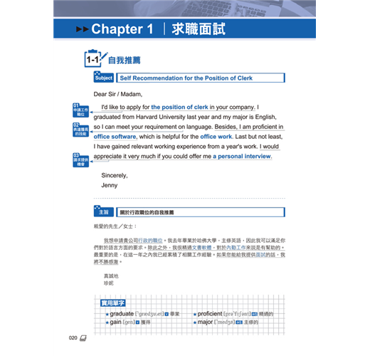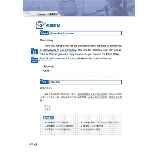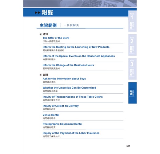 從求職信到錄取感謝信;從詢問產品到下訂單,根據完整的商務信件交流編排,最能應變各種情況。