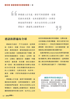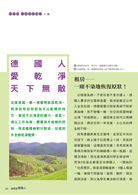 尊重隱私,不怕上法庭/德國人教育扎實重基礎/德國人均衡個人與群體、健身與法治/德國人珍愛森林當國寶/德國人回收垃圾成資源/學德文暢遊歐陸/德國人加薪延假鼓勵生產
