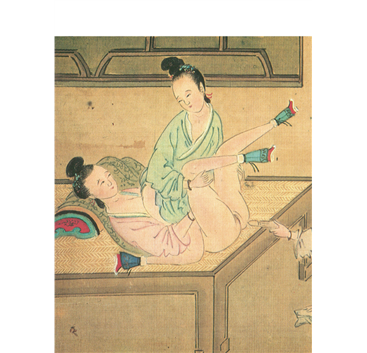 清朝咸豐、同治年間的《後宮秘戲圖》卷,繪有十段兩女相狎之秘戲,其中大部份都是一宮女腰繫假陽扮男子,與另一宮婦交合的畫面,只不過變換了不同的姿勢,在不同的地方(或床榻、或椅墩、或蓆地)玩罷了。與手持假陽的玩法相比較,腰繫假陽更像個男人,玩時也更多肌膚相貼的機會,所以比前者更勝一籌,樂於為女同志所採用。