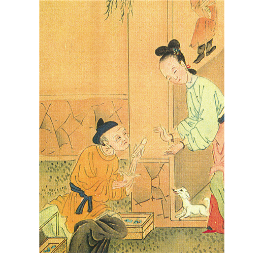 清中葉佚名畫家所繪「北京民間風俗百圖」中,有一幅描繪江湖郎中的「串鈴賣藥圖」,他右臂縣掛的黃布囊中,說不定就有一根假陽具。此圖的解說云:「此中國串鈴賣藥之圖也,其人係江湖之土郎中,微通醫術、明點藥性,口有佞才,即往各省遊藝,一手持串鈴搖動,一手持招牌上寫藥名不等;看病時,目視其色,言能變化,尚代賣藥,無非求衣食。」最末五句移來形容明崇儼替武則天看病的情景,誰曰不宜呢?