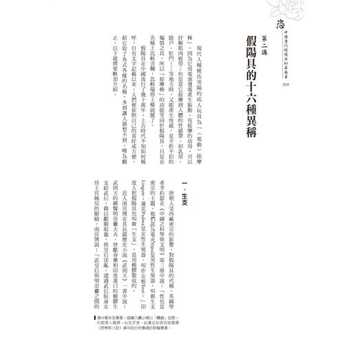 講述兒童玩具的專書很多,中、日、英文的不下幾十種,《漢聲》雜誌還曾出過兩期「童玩專輯」;但是有系統介紹成人玩具的專書,相對來說就十分罕見了。「蜀中無大將,廖化作先鋒」,希望這本珍稀的《恣──中國古代假陽具的真面目》可以收拋磚引玉之效,並期待四海高明之士不吝賜教。