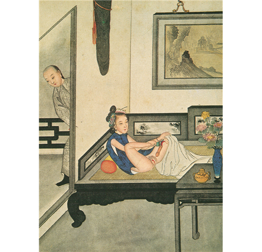 清中葉一幅紙本春畫「姦戲」,描繪一穿粉紅色上衣女子仰臥床榻,裸露下半身,高舉兩腿,另一綠衣女子跨騎在她身上,兩手挽持著她的腿彎,使其雙腿大張;第三個穿藕色衣女子單腿跪於榻前,一手撐地、一手持假陽具往仰臥女子大張的牝戶搗去。這是古代中國手持假陽搗弄的一個圖例。