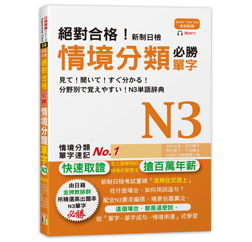 《絕對合格!新制日檢 必勝N3情境分類單字》本著利用「喝咖啡時間」,也能「倍增單字量」「提升日語實力」的意旨,附贈日語朗讀光碟,讓您不論是站在公車站牌前發呆,一個人喝咖啡,或等親朋好友,都能隨時隨地聽MP3,無時無刻增進日語單字能力,讓您無論走到哪,都能學到哪!怎麼考,怎麼過!