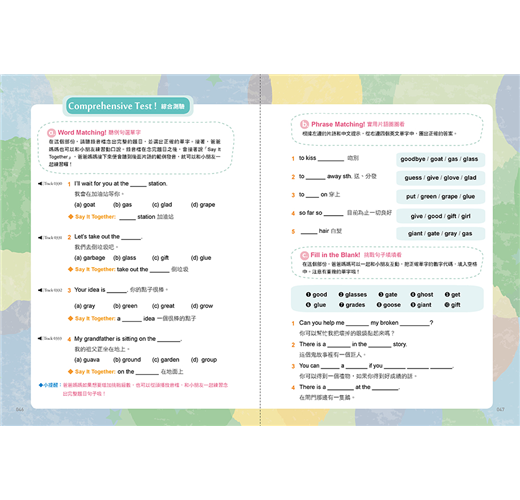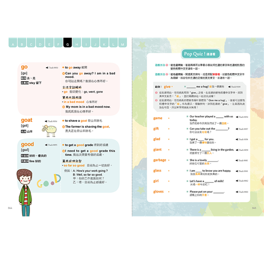本書的特色之一在於貼心設計的隨堂測驗,以及在每個單字最後皆有收錄的綜合統整測驗。每個單字依照單字數量,附2~5篇不等的「Pop Quiz! 連連看」練習,除了可以單純作為閱讀測驗,也可以搭配錄音檔測試自己的聽力,和小朋友一起動手練習。接著,在每個單字最後加碼附上的統整綜合測驗中,還囊括了「聽例句選單字」、「實用片語圈圈看」,以及「挑戰句子填填看」三大測驗題型,讓親子英文單字書既可以具高度玩樂性質,又能一手掌握基礎單字!