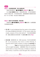 【關鍵詞】中心主旨句和細節訊息●段落標題配對題最需要的其實是區分主旨句和supporting details,supporting details為干擾選項,且通常能運用像是for example等的關鍵詞,讀for example前的訊息即可,片語前面的敘述多為中心主旨句,後面5-6句段落細節部分可以跳過不看,逐步答完所有段落標題題(且主旨句通常為正確答案的同義改寫),大幅減少閱讀時間。