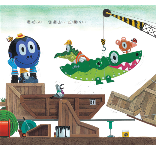 大象開著挖土機,長頸鹿搬了好多磚塊,鱷魚扛著木板在確認……每隻動物都好忙,請小朋友們跟著書中的動物朋友一起猜一猜,他們的「大工程」是什麼呢?