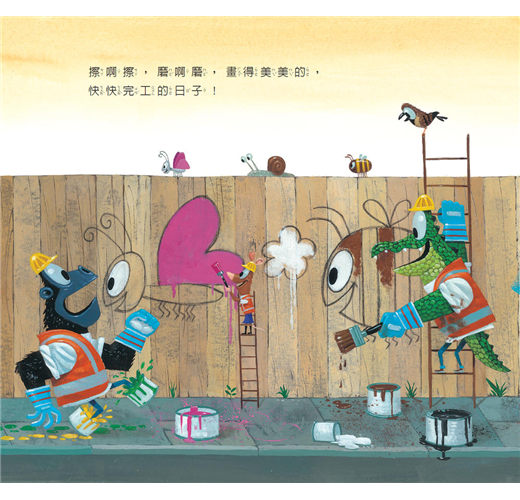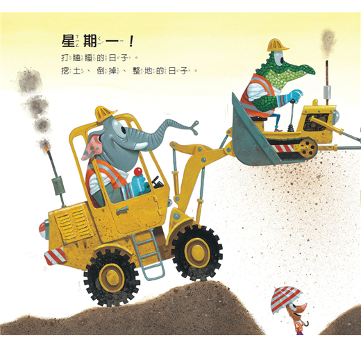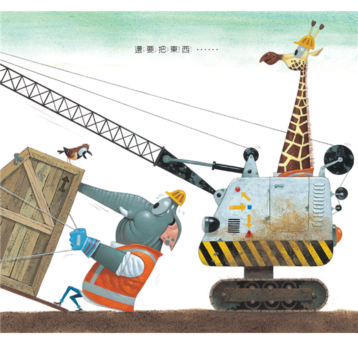 磚頭交給你,大象來挖土,他去搬磚塊,我來量尺寸……每隻動物都忙著做好自己的事情,一件「大工程」就在大家齊心協力下慢慢的完成。每一件很難或是很繁雜的工作也都可以這樣試試看,大家一起分工合作,負責好自己的部分,慢慢的,工作就可以完成啦。