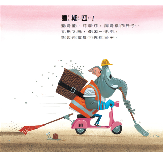 動物朋友們按照著一週的順序,開始執行「大工程」,這就像是小朋友在做功課一樣,必須按照步驟,一步接一步,才不會漏掉該注意的小細節唷,跟著動物朋友們一起按部就班吧!
