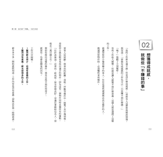 ←所謂的「只做你喜歡的事情」意思是「只以你喜歡的事為目標」,這句話後面還隱藏著下半句:「為此就必須去做你不喜歡的事。」可別只理解一半。「個人特色」、「自信」、「賺錢」這三點有可能並存,