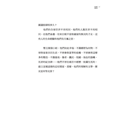 暫且做個小結。他們如此幸福,不識鄉野為何物,不曾與家畜共同生活,不曾參與夏季的收穫,不曾參與這麼多的戰役,不識墓地、傷者、饑民、祖國、染血的旗幟、死者的紀念碑……他們不曾在痛苦中經歷,攸關生死的,建立某種道德的迫切需要,那麼,他們所理解的文學、歷史是何等光景?