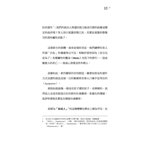 我稱為「初成人」的這種轉變在歷史上極為罕見,在我們的時代,在我們的各種群體中,這些轉變造成如此寬闊、如此明顯的裂縫,卻鮮少有目光將之與顯而易見的那些時期相提並論──諸如新石器時代、基督教年代的初啟、中世紀的終結和文藝復興。