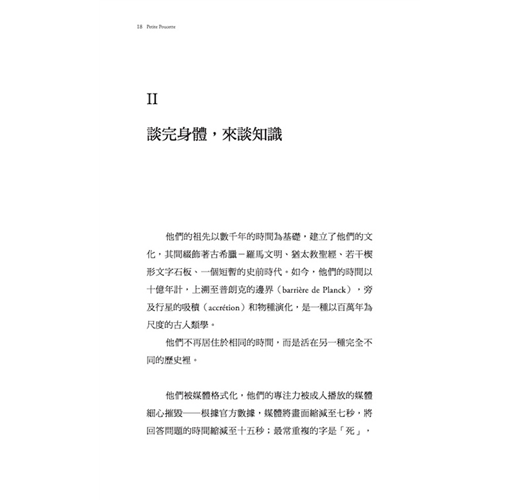 我原本是學院的史學研究者,如今成為了一名外交官;在世界的另一端,代表著法國,代表法國的藝術家、學者及科學家們。打我從事這個新的職業起,就竭盡所能的拼:促進聯繫、建立合作、籌劃及鼓勵。而在這十到十五年間,種種新的通訊工具改變了這個職業:眼睛盯著螢幕、指頭滑在手機,我加速時間,我縮短距離,我讓點子、聯絡、創意都數以倍計 – 我,還有我的合作對象、我的工作伙伴、連我的家人都一樣,都被做(Faire)的眩目迷離給捲了進去。但其實,那我還算是知識分子的過往,只在不久以前……那時我花時間去思考。閱讀許多書籍的時間。那時我會對一個思想追根究柢,而不是撲撈那些一閃而逝的點子。