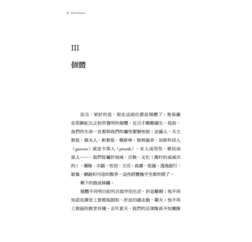 而且,更好的是,現在這兩位都是個體了。聖保羅在耶穌紀元之初所發明的個體,近日才剛剛誕生。從前,我們的生命一直都與我們的屬性緊緊相依:法國人、天主教徒、猶太人、新教徒、穆斯林、無神論者、加斯科涅人(gascons)或皮卡第人(picards)、女人或男性、貧民或富人……,我們從屬於地域、宗教、文化(農村的或城市的)、團隊、市鎮、性別、方言、政黨、祖國。透過旅行、影像、網路和可惡的戰爭,這些群體幾乎全都炸開了。