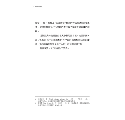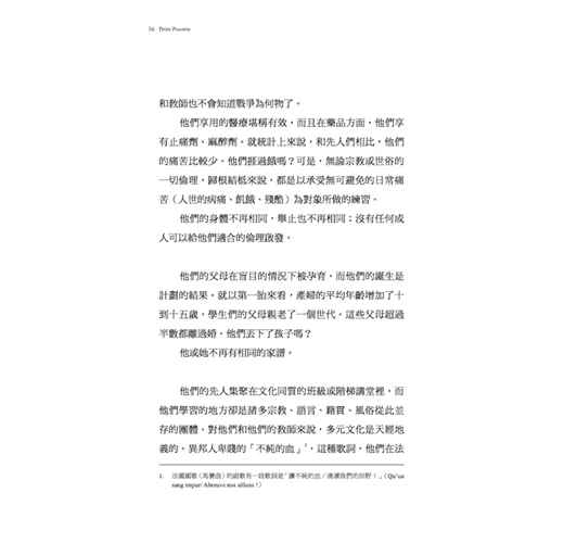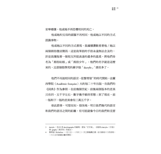 他們不再說相同的語言。從黎胥留的時代開始,法蘭西學院(Académie française)大約每二十年出版一次我們的《詞典》作為參照。在前幾個世紀,前後兩個版本的差異只有四、五千字左右,數字幾乎維持常態;到了現在,前一版和下一版的差異會有三萬五千字。
