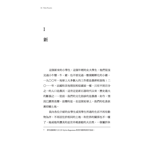 這個新來的小學生,這個年輕的女大學生,他們從沒見過小牛犢、牛、豬,也不曾見過一整窩剛孵化的小雞。一九〇〇年,地球上大多數人的工作都是農耕和放牧;二〇一一年,法國和其他情況相似國家一樣,只有不到百分之一的人口是農民。這肯定是新石器時代以來,歷史最大的斷裂之一。從前,我們的文化指涉的是農務,如今,情況已驟然改變,沒變的是,在這個星球上,我們的吃食依舊仰賴土地。