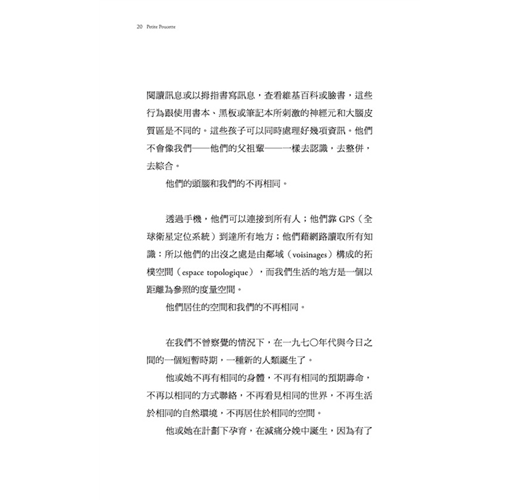 這些孩子居住在虛擬之中。認知科學顯示,使用網路,閱讀訊息或以拇指書寫訊息,查看「維基百科」或「臉書」,這些行為跟使用書本、黑板或筆記本所刺激的神經元和大腦皮質區是不同的。這些孩子可以同時處理好幾項資訊。他們不會像我們──他們的父祖輩──一樣去認識,去整併,去綜合。