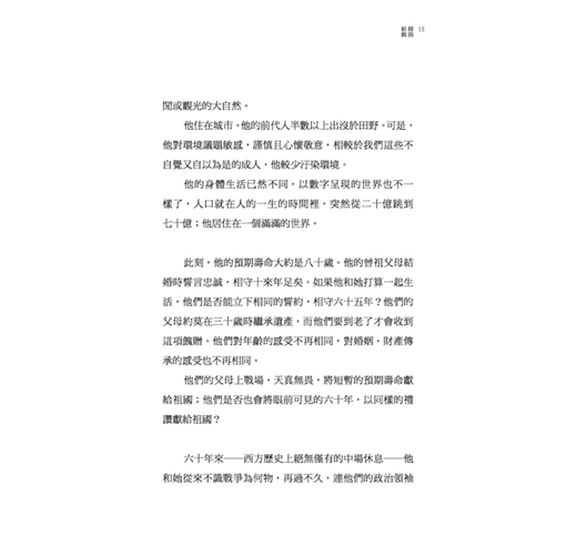 此刻,他的預期壽命大約是八十歲。他的曾祖父母結婚時誓言忠誠,相守十來年足矣。如果他和她打算一起生活,他們是否能立下相同的誓約,相守六十五年?他們的父母約莫在三十歲時繼承遺產,而他們要到老了才會收到這項餽贈。他們對年齡的感受不再相同,對婚姻、財產傳承的感受也不再相同。