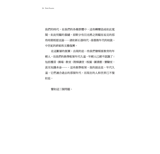 在這斷層的側翼,出現的是一些我們聲稱要教育的年輕人,而我們的教學框架年代久遠,年輕人已經不認識了:包括樓房、操場、教室、階梯講堂、校園、圖書館、實驗室,甚至知識本身……,這些教學框架,我的說法是,年代久遠,它們適合過去的那個年代,而現在的人和世界已不復如是。