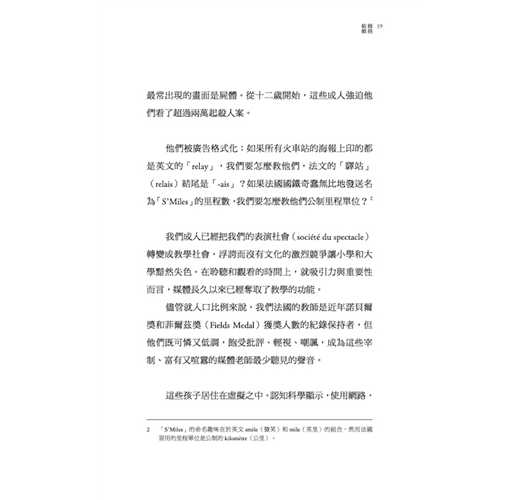 儘管就人口比例來說,我們法國的教師是近年諾貝爾獎和菲爾茲獎(Fields Medal)獲獎人數的紀錄保持者,但他們既可憐又低調,飽受批評、輕視、嘲諷,成為這些宰制、富有又喧囂的媒體老師最少聽見的聲音