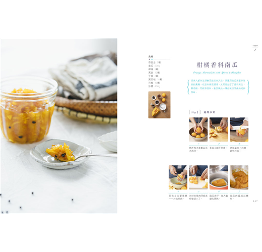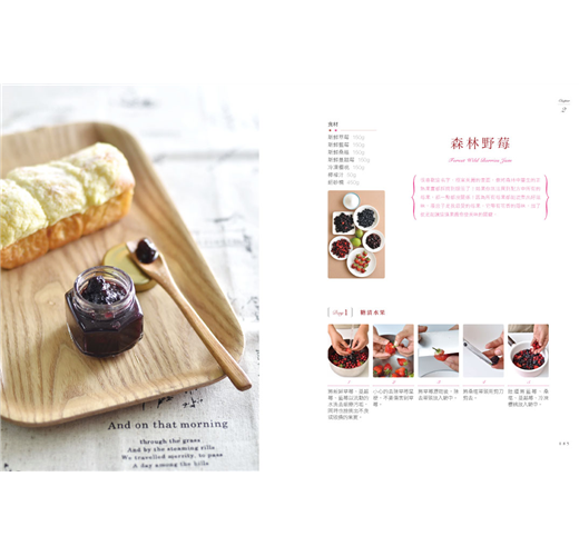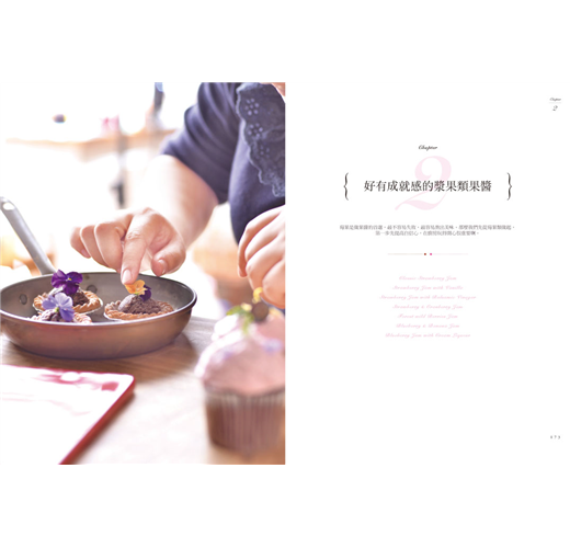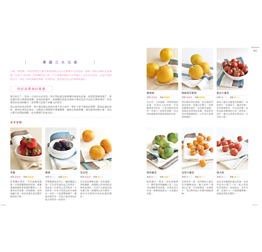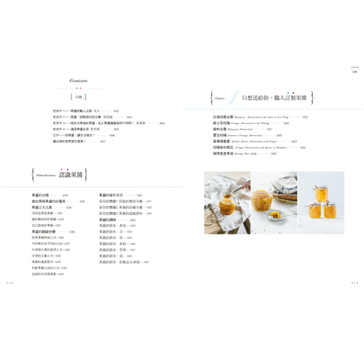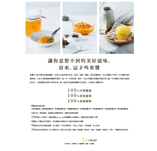 ◣56款最in風味果醬:果醬愛好者的第一選擇,漿果類果醬、低果膠果醬、柑橘類果醬、花香調果醬、茶香調果醬、酒香調果醬、香料調果醬、特別訂製類果醬。堅持使用在地農產品製作果醬,不辭辛苦跑遍台灣大小農園尋找,只為了使用天然無毒食材熬出最原始且純粹的一口果醬。自己做果醬,用新鮮水果,用健康食材,不用化學原料,沒有人工色素,一切天然無毒,吃得安心,一年四季都可嘗到自製美味的健康果醬;自己做果醬,步驟簡單,即便是新手也能作出令人驚艷的好味道,成就感十足。