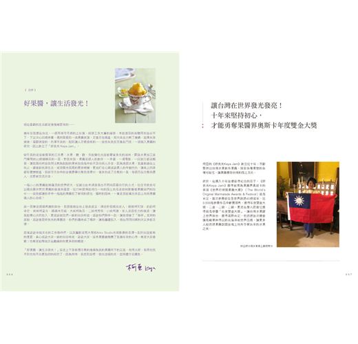 她濃縮台灣風土結成的果實,以無添加、手工精製的純粹,讓視覺、嗅覺與味覺重新體驗「好吃」,也嘗試將人文精神與生活靈感融入手工果醬與其延伸出的甜點,分享「好食材、好信念、簡單烹調,一起擁有美味好食光」的初衷,期盼以廚房為基地的強大療癒力、食物撫慰人心的魔力、飲食生活品味的影響力能如漣漪般擴大。
