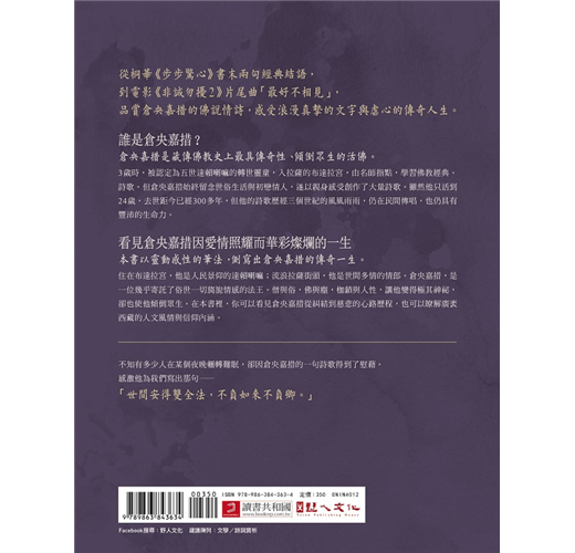 住在布達拉宮,他是人民景仰的達賴喇嘛;流浪拉薩街頭,他是世間多情的情郎。倉央嘉措,是一位幾乎寄託了俗世一切旖旎情感的法王。僧與俗,佛與塵,枷鎖與人性,讓他變得極其神祕,卻也使他傾倒眾生。在本書裡,你可以看見倉央嘉措從糾結到慈悲的心路歷程,也可以瞭解廣袤西藏的人文風情與信仰內涵。