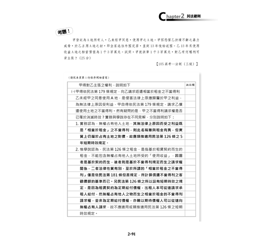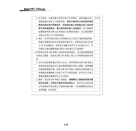 筆者認為,作答不是單純以文字呈現所學而已,更涉及概念的鋪陳與邏輯的分析,作答的好壞與天賦無關,而是必須有好的範本加以參考並反覆思索,這正是本書之所以附上試題與詳解的原因。然而,筆者仍期望於今年底可以完成一本單純以作答為內容的民法書籍,以更進一步強化讀者實際答題時的寫作能力,並利用題目所提供的案例事實,與讀者一同思考如何在具體事例下進行利益衡量。