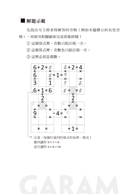 《GARAM算術拼圖》只要學過基本的加減乘除就可以進行練習。愈小的學生愈適合!有鑑於現在學生普遍計算能力與數感低落,建議可以從小一生開始訓練,每天一回,家長陪練的同時也能增進親子關係,書內題目是從易到難的設計,很貼心。