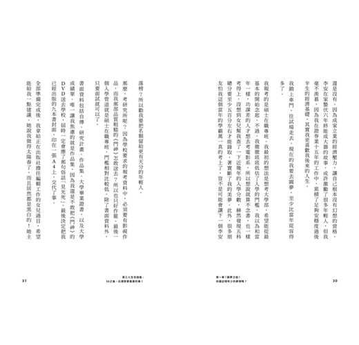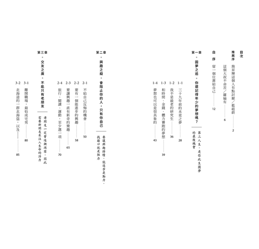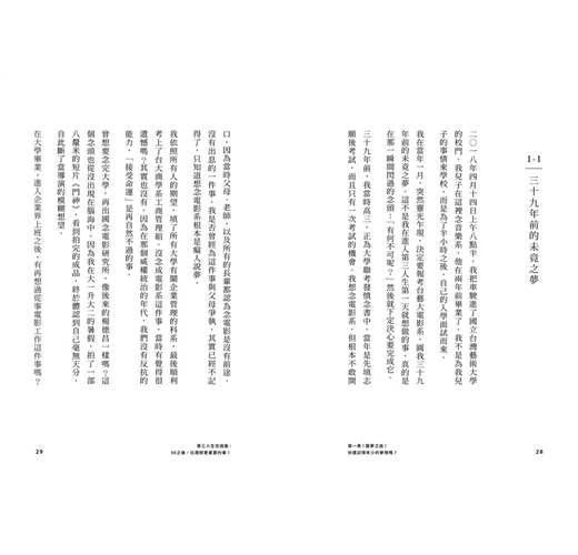 很多讀者看到「夢想」兩個字或許就卻步,一來可能自己根本沒有什麼夢想,二來被媒體歌頌的追夢故事都太夢幻、太遙不可及了,看完之後除了嚮往之外,只會讓自己更挫折。我其實至今也不過只完成了一個去念電影系碩士班的夢想,別以為很難做到,因為其他研究所像我這把年紀的同學也非常多。或許就從一個最小、最容易的夢想下手吧!只要去做,就會讓第三人生充滿意義。